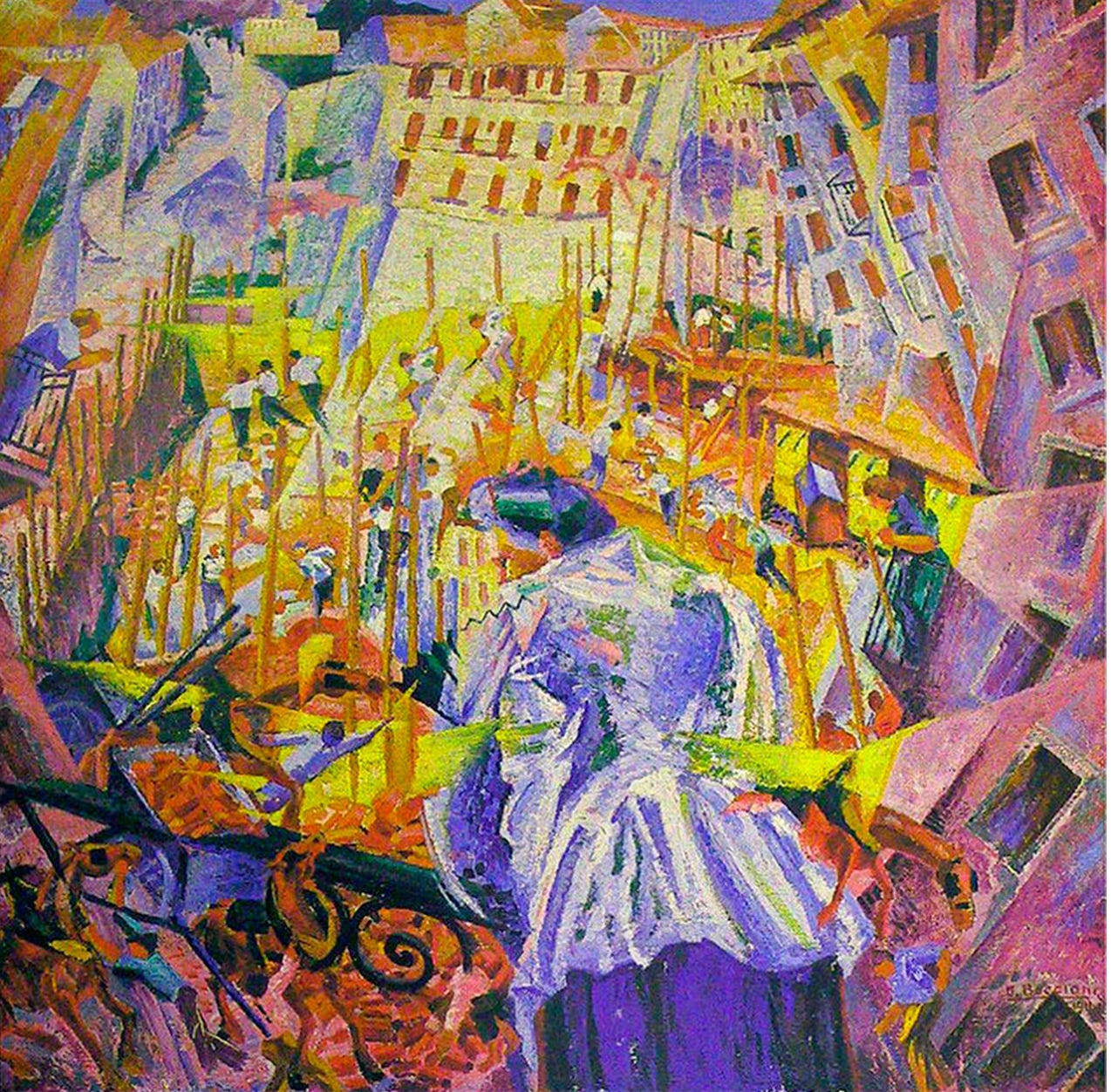 Boccioni’nin Street Enter The House resminde ise, kadın figürüyle iç ve dış mekân birbirine karışır, sokağın gürültüsü evin içine akar. Sarkan kadının ve çevrenin sınırları belli değildir, balkon artık bir geçirgen zardır.